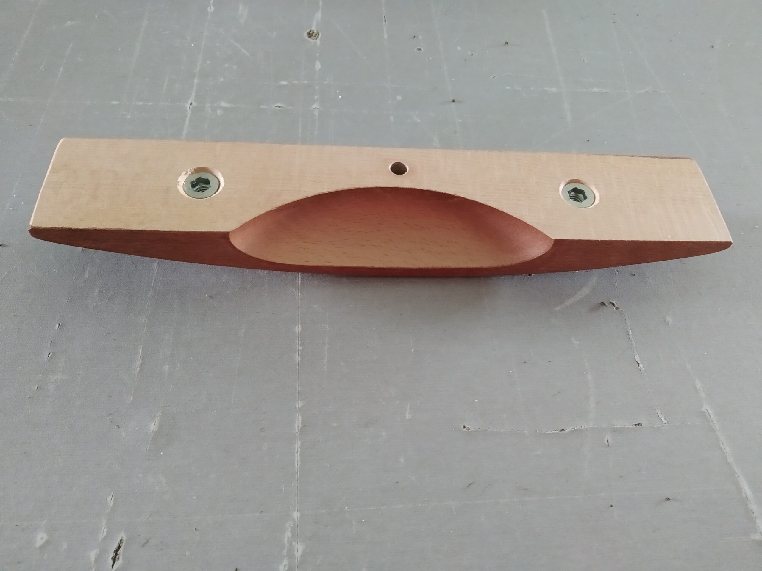 Pega em madeira com cavidade para a mão. Cor Cerejeira. Com porca embutida para parafuso M6.